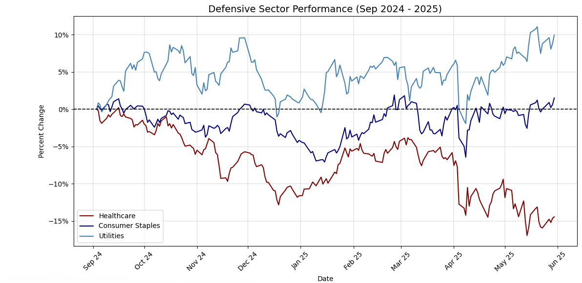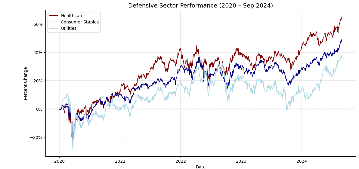 Sector Data from ETFs: XLV (Healthcare), XLP (Consumer Staples), XLU (Utilities).