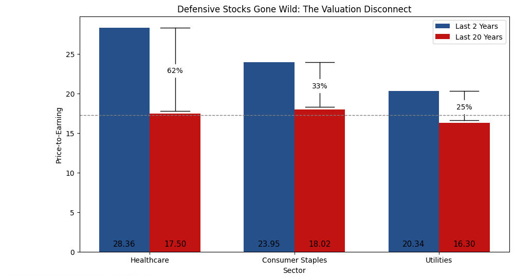Healthcare's valuation exceeded the 20-year average for the healthcare sector of 17.50 by about 62%, showing it had become significantly overpriced. While healthcare valuations ballooned after pandemic-related investment, Consumer Staples and Utilities kept more reasonable valuations with overvaluations of 32% and 24% respectively.
