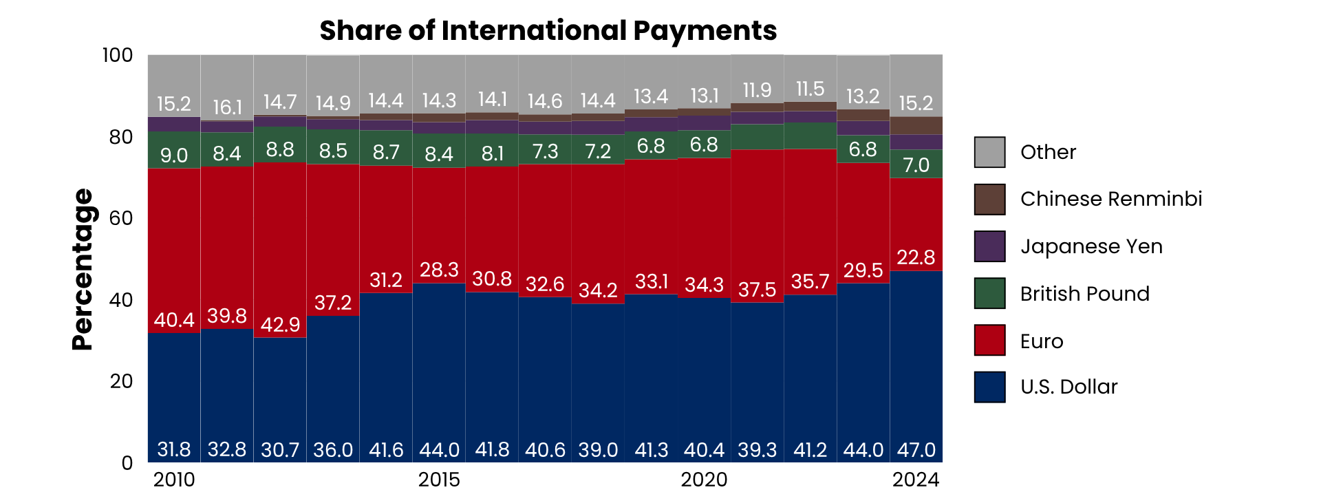 Beyond currency trading, the dollar's dominance extends to the actual movement of money across borders. Data from SWIFT, the global messaging system that facilitates international payments, shows that 50% of all international payment messages involve the US dollar. When intra-euro area payments are excluded from the calculation, this figure jumps to approximately 60%.