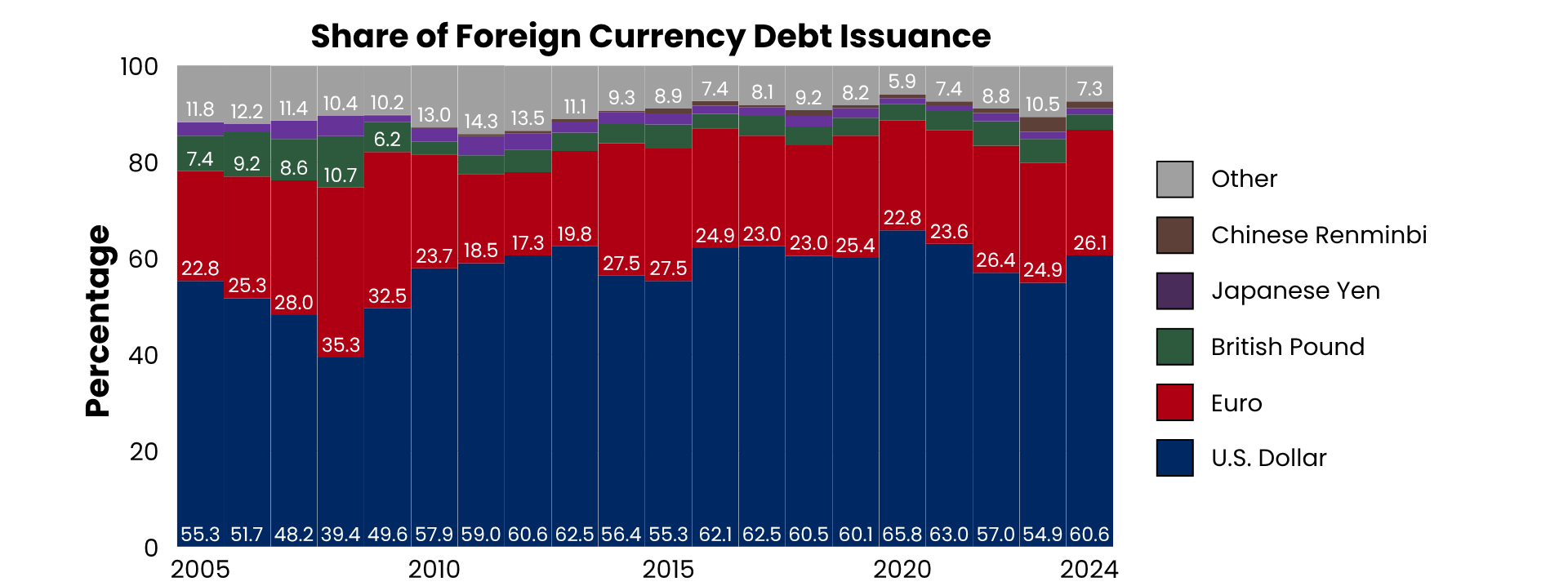 The euro, despite the European Union's economic size, accounts for only 26% of foreign currency debt issuance. All other currencies combined—including the yen, pound, and renminbi—make up the remaining 14%. This concentration means that companies and governments worldwide must regularly access dollar funding markets, regardless of their home currency.