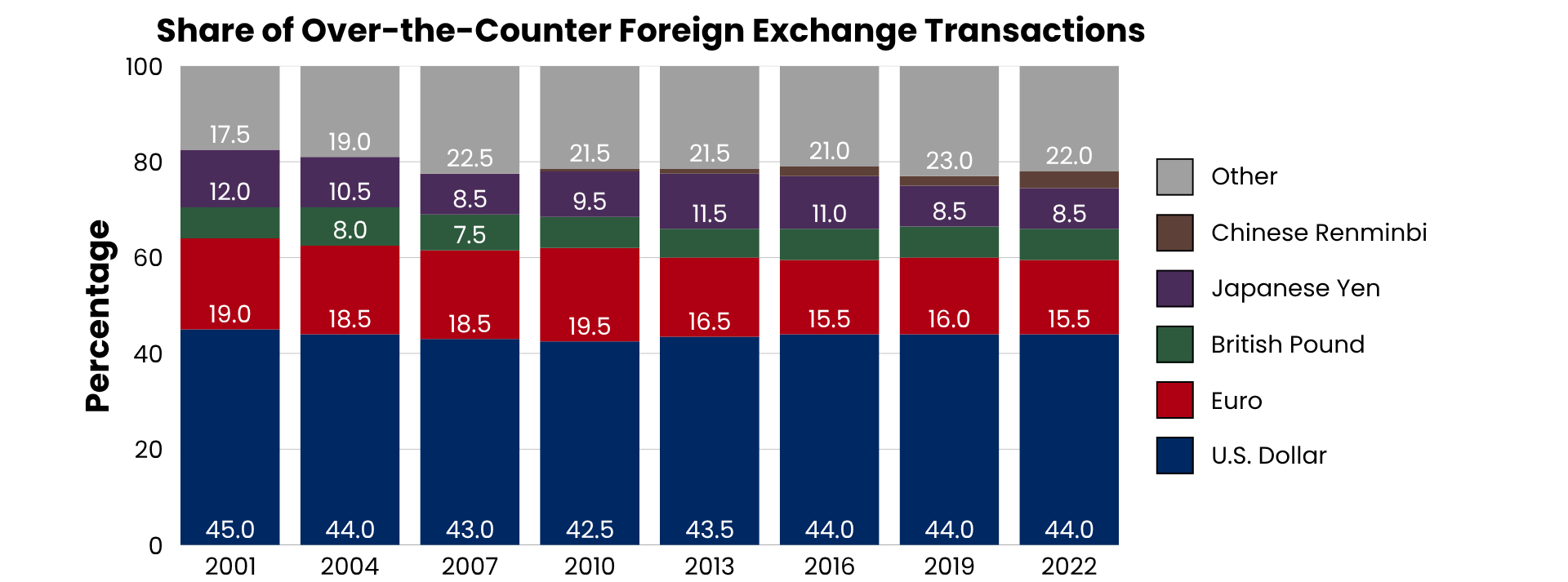 The foundation of dollar dominance lies in the foreign exchange market, where 44% of all global currency transactions in 2022 involved the US dollar as one side of the trade. This figure, drawn from the Bank for International Settlements' triennial survey and adjusted to show single-currency participation rates, represents a remarkable consistency—the dollar's share in FX markets has remained virtually unchanged over two decades, hovering between 42-45% since the early 2000s.