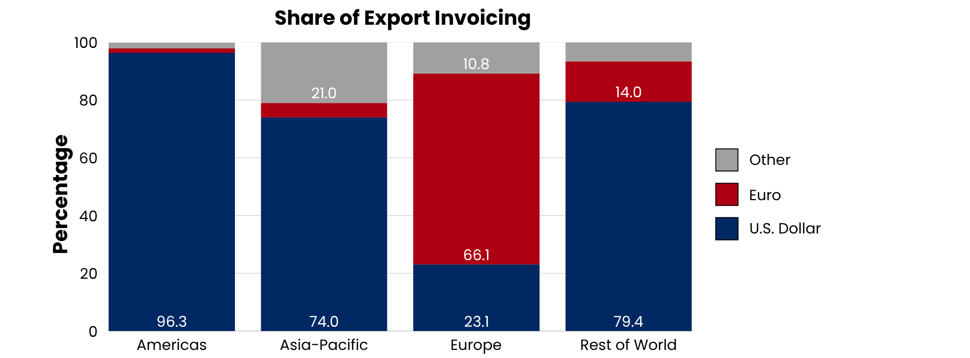 The Asia-Pacific region shows the dollar's reach into markets thousands of miles from American shores: 74% of trade invoicing uses dollars, compared to just 6% for the region's own currencies combined. Even in Europe, where the euro dominates with 66% of trade invoicing, the dollar still accounts for 23% of transactions—a significant presence in the eurozone's backyard.