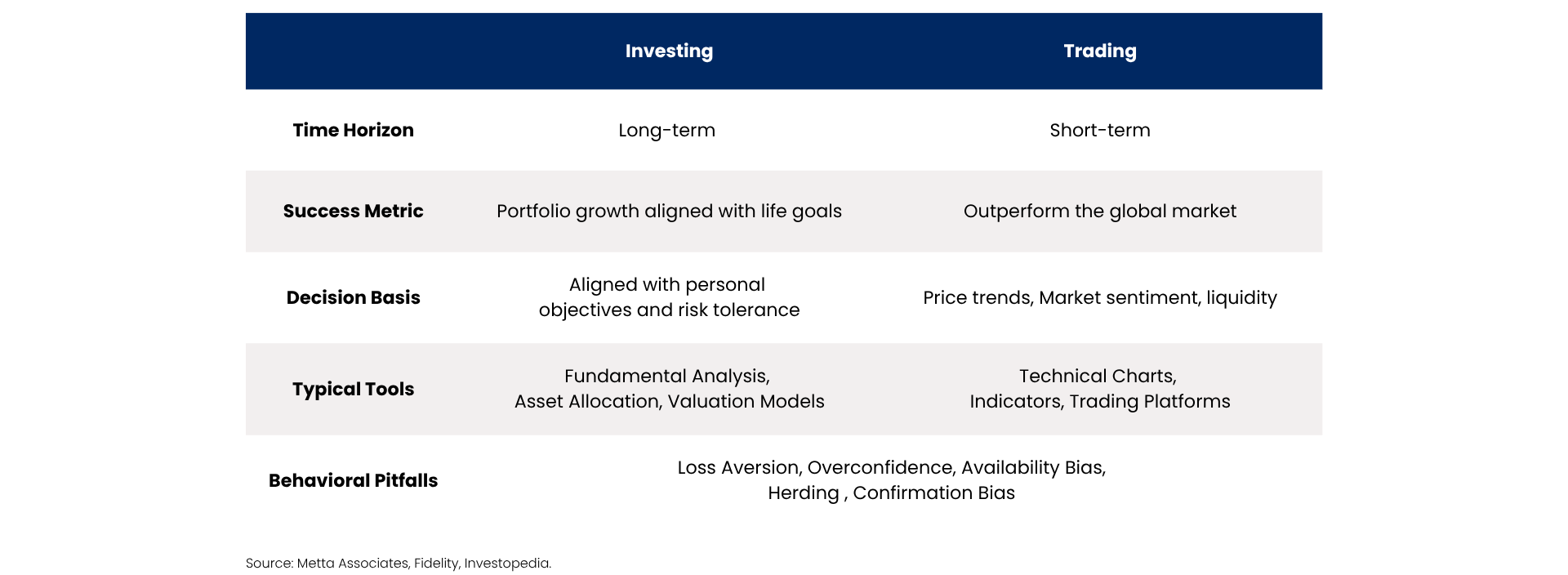 At Metta Associates, clarity is not a luxury but a foundation for long-term success. In markets that reward speed and constant reaction, we keep clients focused on purpose so that every decision reflects the plan rather than pressure. The distinction between investing and trading is not merely technical; it shapes behavior under uncertainty and, if blurred, leads to inconsistent choices and avoidable risk.