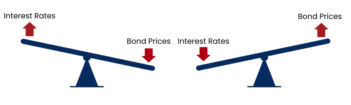 The chart above illustrates the fundamental principle of bond investing: when interest rates rise, bond prices fall — and when rates fall, bond prices climb. This inverse relationship exists because newly issued bonds adjust to the new rate environment. Older bonds, which pay lower coupons, must trade at a discount to remain competitive.