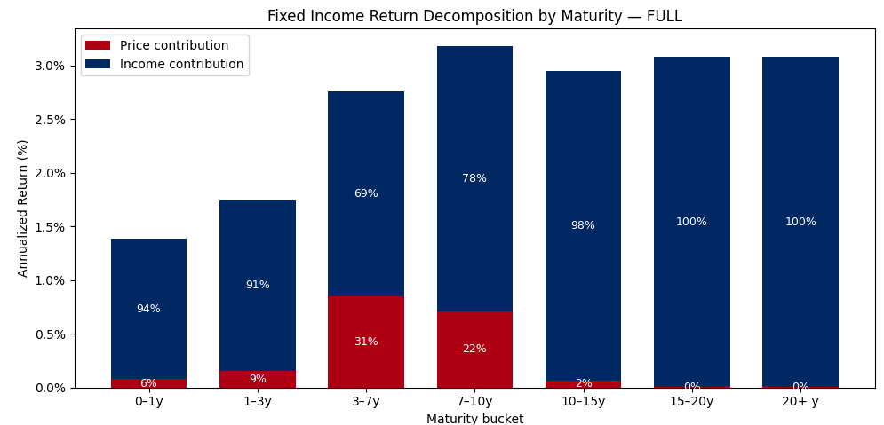 Beyond 15 years, bonds start to lose their dynamism, their returns come almost entirely from coupons, while price appreciation fades away. In other words, the bond becomes a “set-and-forget” instrument: stable, but no longer a source of balance when markets move. The absence of price response means the bond stops working as a true diversifier. That’s why we taper duration instead of stretching it. By focusing on the middle of the curve, investors stay connected to both worlds. The steady cash flow of income and the potential uplift from market movement. This sweet spot keeps bonds relevant, not as passive holdings, but as active contributors to portfolio performance.