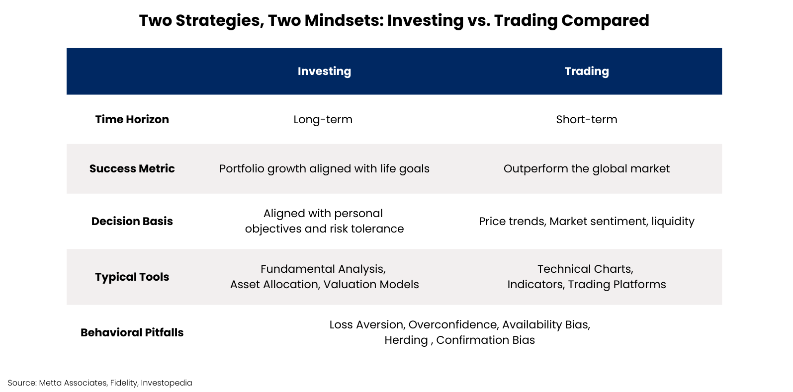 At Metta Associates, clarity is not a luxury but a foundation for long-term success. In markets that reward speed and constant reaction, we keep clients focused on purpose so that every decision reflects the plan rather than pressure. The distinction between investing and trading is not merely technical; it shapes behavior under uncertainty and, if blurred, leads to inconsistent choices and avoidable risk.
