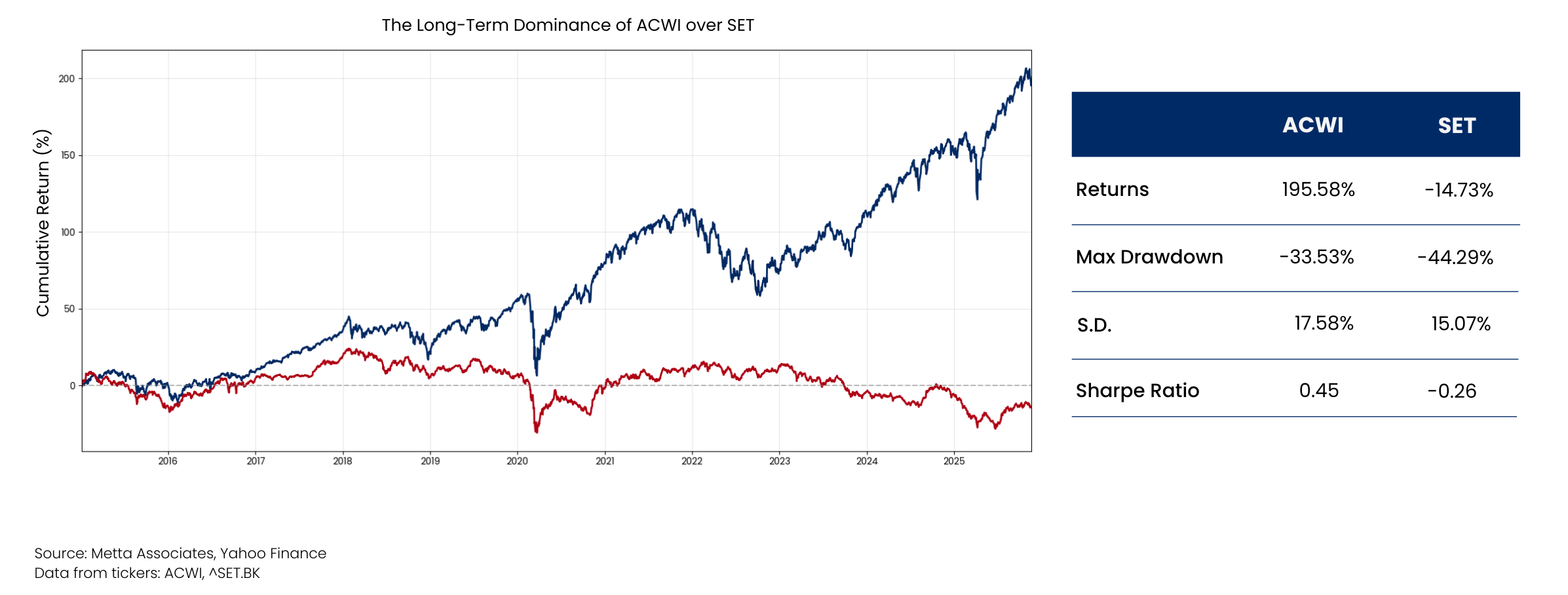 Concentration Risks When markets fluctuate, returns can vary sharply—especially if the fund invests in only a few countries or sectors, for example, ThaiESG funds which concentrate investments in Thai issuers. To see the real impact of investing in a single market, compare the performance of ACWI Index(representing the diversified global market) versus Set Index(representing the Thai market) below: