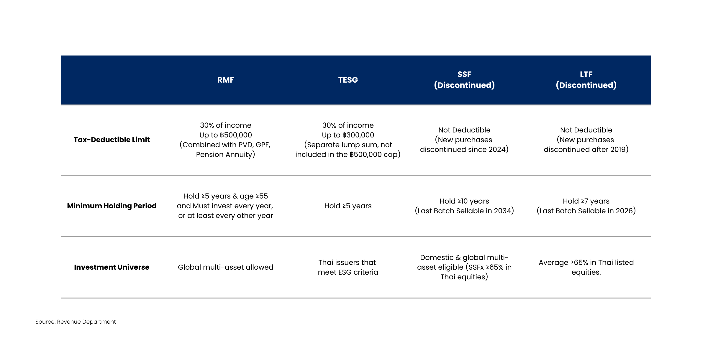 Every year, as the tax season approaches, investors rush to invest in tax-saving funds such as RMFs, ThaiESG funds, as well as LTFs and SSFs — both of which are no longer available for new tax-deductible investments but were once popular choices among investors seeking tax benefits. Many still view these funds as a sign of financial discipline and smart planning, combining the goals of reducing taxes and building long-term wealth.
